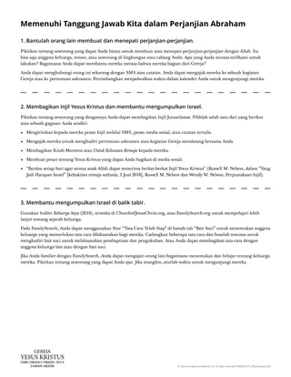 Tuhan membuat perjanjian dengan Abraham dan keturunannya. Sebagai benih keturunan Abraham, kita memiliki tanggung jawab perjanjian untuk mendatangkan berkat-berkat Injil Juruselamat kepada semua keluarga di bumi. Pelajaran ini akan membantu siswa menindaki tanggung jawab yang telah Tuhan berikan kepada mereka sebagai benih keturunan Abraham.