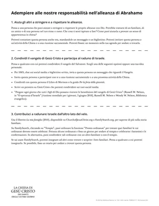 Questa parte della lezione dà agli studenti tempo per fare qualcosa che li aiuti ad adempiere le loro responsabilità nell’alleanza di Abrahamo. Potresti creare delle postazioni di apprendimento sulla base della scheda seguente. Gli studenti possono scegliere un’attività su cui concentrarsi o fare a rotazione tra le diverse attività. Potresti designare uno studente a capo di ogni postazione con l’incarico di aiutare i suoi compagni a completare gli esercizi. Invita gli studenti a cercare l’ispirazione quando scelgono su cosa concentrarsi.