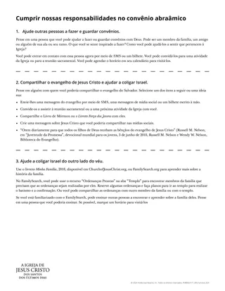 Se os alunos estudaram a Lição 23: “Gênesis 12; 17”, peça-lhes que resumam com um colega o que lembram sobre o convênio abraâmico. Ajude os alunos a ver que, como semente ou posteridade de Abraão, não apenas recebemos bênçãos significativas que nos foram prometidas, mas também fazemos convênio de cumprir responsabilidades importantes. Peça-lhes que concluam a autoavaliação a seguir.