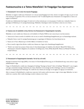 Sauniuniga a le tagata aoga: Valaaulia tagata aoga e mafaufau e uiga i fesili nei ma talanoaina ma se tagata o le aiga: Aisea e taua ai le talalelei a Iesu Keriso ia te oe? Aisea e te manatu ai e manaʻomia e tagata uma?”