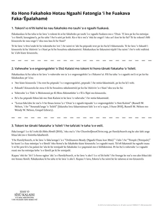 Mahalo ʻoku mou saiʻia he mūsiká, ʻatelitá, pe poto he ngāue fakamakēniká, pea ʻe ʻi ai e ʻaho te ke ngāue ʻi ha ngāueʻanga pe ʻi he tafaʻaki fakaʻātí. Neongo ‘oku mahuʻinga e ngaahi ‘ekitivitī mo e ngaahi ngāue maʻuʻanga moʻui ko iá, ka ‘oku ‘ikai te nau fakamahinoʻi pe ko hai ‘a kitautolu. Ko e fika ‘uluaki mo e muʻomuʻa tahá, ko e kakai fakalaumālie ‘a kitautolu. Ko e ngaahi foha [mo e ngaahi ʻofefine] kitautolu ʻo e ʻOtuá pea ko e hako ʻo ʻĒpalahame. (“Becoming a Missionary,” Liahona, Nōvema 2005, 47)