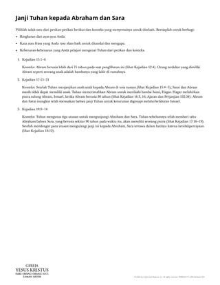 Selebaran berjudul “Janji Tuhan kepada Abraham dan Sara” dapat membantu siswa berlatih menggunakan konteks untuk lebih memahami apa yang mereka baca dalam tulisan suci. Anda dapat mencontohkan ini dengan menelaah Kejadian 15:1–6 bersama anggota kelas. Anda kemudian dapat menempatkan siswa dalam kelompok-kelompok kecil untuk menelaah ayat-ayat lainnya.