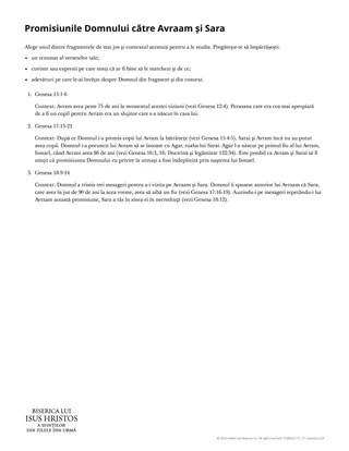 Foaia de prezentare intitulată „Promisiunile Domnului către Avraam și Sara” poate ajuta cursanții să exerseze folosirea contextului pentru a înțelege mai bine ce citesc din scripturi. Puteți exemplifica acest lucru studiind Genesa 15:1-6 cu toți membrii clasei. Apoi, puteți organiza cursanții în grupuri mici pentru a studia celelalte versete.