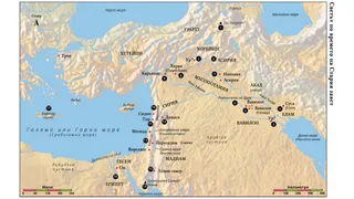 За да помогнете на учениците по-добре да разберат контекста на Битие 24, поканете ги да прегледат следната карта. Ако имат достъп до Библейски карти, може да я намерят като карта 9 „Светът по времето на Стария завет“. Прочетете или обобщете следния абзац и поканете учениците да открият местата, които споменавате на картата. Ако е необходимо, покажете къде са Ханаан (номер 13) и Харан (номер 8).