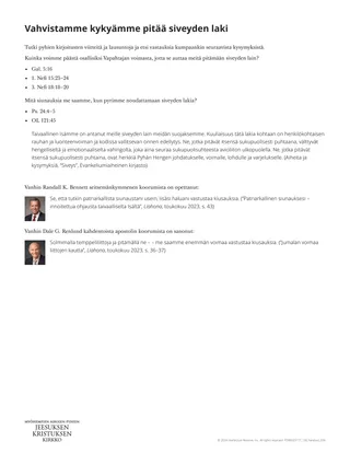 Miehen ja naisen välisen avioliiton ulkopuolella on väärin koskettaa toisen ihmisen ruumiin yksityisiä, pyhiä osia, vaikka vaatteet olisivatkin päällä. Kun teet valintoja siitä, mitä teet, katsot, luet, kuuntelet, ajattelet, julkaiset tai tekstaat, vältä kaikkea, mikä herättää tarkoituksellisesti himokkaita tunteita muissa tai itsessäsi. Tämä tarkoittaa myös kaikenlaista pornografiaa. (Nuorten voimaksi – opas valintojen tekemiseen, s. 23, 25)