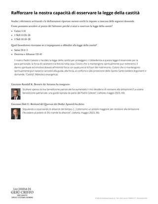 Alcune risposte che gli studenti potrebbero dare sono: scattare o inviare fotografie inappropriate, guardare o ascoltare contenuti multimediali che siano sessualmente allusivi o espliciti, non mantenere sacri il sesso e i relativi sentimenti. Se gli studenti hanno domande sull’attrazione verso persone dello stesso sesso, potrebbe essere utile spiegare che “provare attrazione verso persone dello stesso sesso non è un peccato. Se [qualcuno prova] questi sentimenti ma non li [asseconda] e non [agisce] in base ad essi, [sta] osservando la sacra legge della castità del Padre Celeste”. (Per la forza della gioventù – Una guida per le tue scelte, 27).