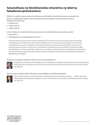 Mba hanampiana ny mpianatra hampitombo ny fahatakarany io fahamarinana io, dia zarao ilay taratasy zaraina nampiarahana amin’ny lesona. Ampiaraho tsiroaroa ny mpianatra ary omeo andraikitra ny mpiara-miasa tsirairay hifantoka amin’ny iray amin’ireo fanotaniana ao amin’ny taratasy zaraina.