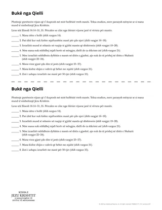 Përndryshe, mund të ftoni grupe të vogla nxënësish të lexojnë tek Eksodi 16:14–31, 35 dhe të krijojnë një pyetësor rreth manës. Ata mund të shkruajnë 3–4 pyetje që mund të marrin përgjigje duke lexuar vargjet. Më pas, grupet mund t’i shkëmbejnë pyetësorët me një grup tjetër.