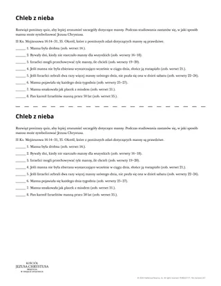 Zachęć uczniów, aby podczas studiowania informacji o mannie skupiali się na Jezusie Chrystusie. Jednym ze sposobów, aby to zrobić, jest wręczenie uczniom ulotki zatytułowanej „Chleb z nieba”. Uczniowie mogą wypełnić ulotki indywidualnie lub w małych grupach.