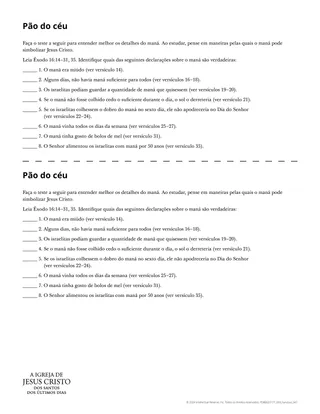 Incentive os alunos a se concentrarem em Jesus Cristo ao estudarem sobre o maná. Uma maneira de fazer isso é entregar aos alunos o material complementar intitulado “O pão do céu”. Os alunos podem preencher a atividade individualmente ou em pequenos grupos.