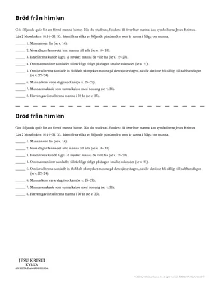Uppmuntra eleverna att fokusera på Jesus Kristus när de läser om manna. Ett sätt att göra det är att ge eleverna utdelningsbladet ”Bröd från himlen”. Eleverna kan arbeta med utdelningsbladet individuellt eller i små grupper.