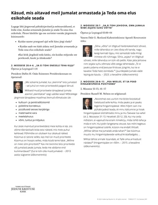 Õpilaste ettevalmistus. Paluge õpilastel loetleda mõned Jumala käsud. Paluge neil arutada pereliikme või sõbraga, kuidas loetletud käsud aitavad neil näidata armastust Jumala vastu ja seada Ta elus esikohale.