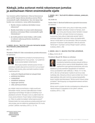 Oppilaan valmistautuminen: Kehota oppilaita laatimaan luettelo Jumalan käskyistä. Kehota heitä keskustelemaan perheenjäsenen tai ystävän kanssa siitä, kuinka heidän kirjoittamansa käskyt auttavat heitä osoittamaan rakkauttaan Jumalaa kohtaan ja asettamaan Hänet etusijalle elämässään.