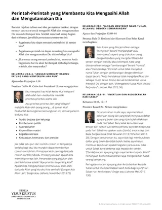 Selebaran penyerta dirancang untuk membantu siswa memahami bagaimana perintah-perintah dalam Keluaran 20:3–11 dapat membantu kita mengasihi Allah dan mengutamakan Dia dalam kehidupan kita. Anda dapat menggunakan selebaran tersebut dalam berbagai cara.