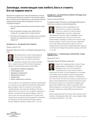 Прилагаемый раздаточный материал призван помочь студентам понять, как заповеди, содержащиеся в Исход 20:3–11, могут помочь нам любить Бога и ставить Его на первое место в нашей жизни. Вы можете использовать раздаточный материал по-разному.