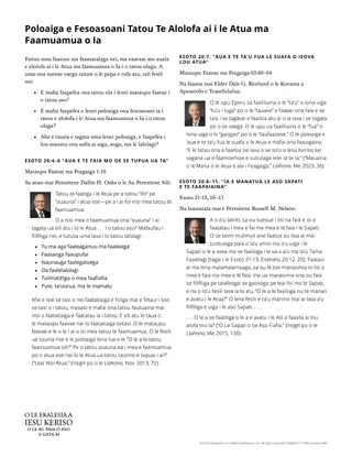 A o e suesue i Tulafono e Sefulu i lenei lesona ma isi lesona, saili pe faapefea ona fesoasoani nei poloaiga ia i tatou ia alolofa i le Atua ma o tatou tuaoi.I le taimi o lenei lesona, o le a e suesue ai i nisi o Tulafono e Sefulu e fesoasoani ia i tatou e alolofa ma faamamalu le Atua.