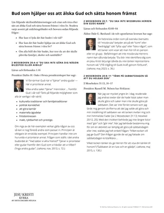 Det medföljande utdelningsbladet är utformat för att hjälpa eleverna förstå hur buden i 2 Moseboken 20:3–11 kan hjälpa oss att älska Gud och sätta honom främst i våra liv. Du kan använda utdelningsbladet på flera olika sätt.