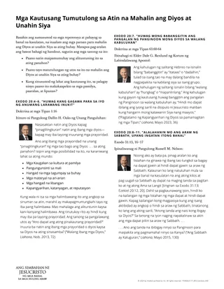 Ang kalakip na handout ay naglalayong tulungan ang mga estudyante na maunawaan kung paano makatutulong ang mga utos sa Exodo 20:3–11 na mahalin ang Diyos at unahin Siya sa ating buhay. Maaari mong gamitin ang handout sa iba’t ibang paraan.