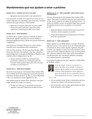 Você pode usar o material complementar “Mandamentos que nos ajudam a amar o próximo” para ajudar os alunos a assumir a responsabilidade por seu aprendizado. Peça-lhes que estudem um dos mandamentos e se preparem para compartilhar o que aprenderam sobre ele. Os alunos podem escolher qual mandamento estudar, ou você pode designar um mandamento a cada aluno. Eles podem estudar individualmente, em duplas ou em pequenos grupos. Divida o material entre os alunos de acordo com o mandamento que estão estudando. Dê aos alunos determinado período de tempo para estudar. Mais tarde na lição, reserve tempo suficiente para a atividade de compartilhar.