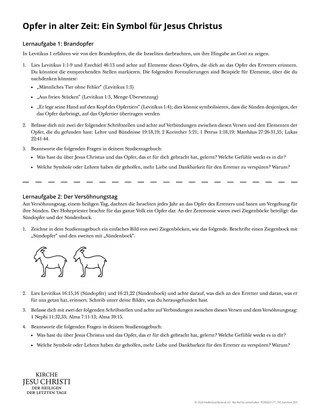 Geben Sie den Schülern Gelegenheit, sich mit einigen in Levitikus beschriebenen Opfern zu befassen. Dazu können Sie beispielsweise das Arbeitsblatt „Opfer in alter Zeit: Ein Symbol für Jesus Christus“ verteilen. Sie können die beiden Aufgaben des Arbeitsblatts einzeln oder beide Aufgaben als ein Arbeitsblatt verteilen.