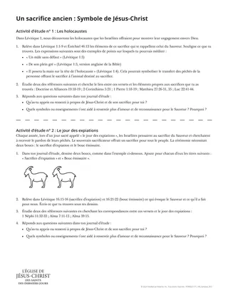 Donnez aux apprenants l’occasion d’étudier des sacrifices décrits dans Lévitique. Pour ce faire, distribuez le document intitulé « Un sacrifice ancien : Symbole de Jésus-Christ ». Distribuez les deux activités du document séparément ou en un seul document.