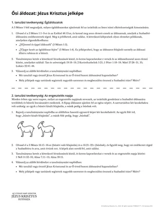 Adj lehetőséget a tanulóknak a 3 Mózesben leírt néhány áldozat tanulmányozására. Ennek az egyik módja az, ha adsz nekik egy-egy példányt az Ősi áldozat: Jézus Krisztus jelképe című kiosztmányból. Külön is kioszthatod a két tevékenységet a kiosztmányból, vagy odaadhatod egy kiosztmányként.
