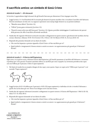 Dai agli studenti la possibilità di studiare alcuni dei sacrifici descritti in Levitico. Un modo per farlo è distribuire la scheda intitolata: “Il sacrificio antico: un simbolo di Gesù Cristo”. Puoi distribuire le due attività della scheda separatamente o in un unico foglio.