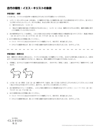 生徒が,レビ記に記されている犠牲の幾つかを研究する機会を設けます。これを行う一つの方法は,「古代のいけにえ:イエス・キリストの象徴」というタイトルの資料を生徒に配ることです。配付資料の二つの活動を別々に配付しても,1つの資料として配付してもかまいません。