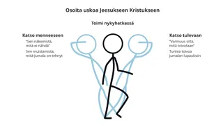 Voisit pyytää oppilaita kertomaan, kuinka he tai joku heidän tuntemansa henkilö on osoittanut uskoa Jeesukseen Kristukseen suuntautumalla tulevaisuuteen, toimimalla nykyhetkessä ja katsomalla menneisyyteen. Voisit myös kertoa jonkin omakohtaisen kokemuksen uskon osoittamisesta Jeesukseen Kristukseen.
