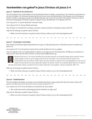 Nadat de Israëlieten door de woestijn waren getrokken, gebood de Heer Jozua om hen het beloofde land in te leiden. Om het beloofde land binnen te gaan, moesten ze geloof in Jezus Christus oefenen. De Israëlieten en een vrouw genaamd Rachab toonden hun geloof in Jezus Christus. In deze les leren de cursisten hoe ze geloof in Jezus Christus kunnen oefenen.