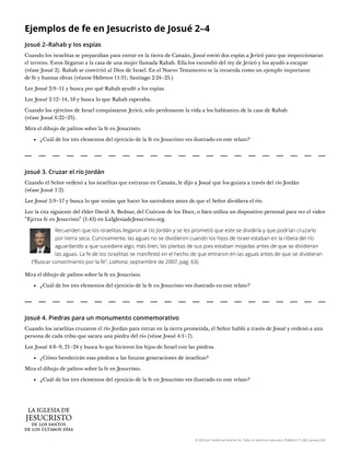 Después del trayecto recorrido por los israelitas en el desierto, el Señor mandó a Josué que los condujera a la tierra prometida. Para entrar en la tierra prometida tenían que ejercer fe en Jesucristo. Los hijos de Israel y una mujer llamada Rahab demostraron su fe en Jesucristo. Esta lección puede ayudar a los alumnos a entender cómo pueden ejercer fe en Jesucristo.