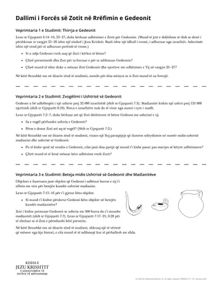 Për t’i ndihmuar nxënësit të shohin se si Zoti e bekoi Gedeonin dhe ushtrinë e tij që u mbështetën tek Ai për forcë, merreni parasysh të përdorni fletushkën “Dallimi i Forcës së Zotit në Rrëfimin e Gedeonit”. Lejojeni secilin nxënës që të familjarizohet me përmbajtjen e çdo pjese të fletushkës. Ka disa mënyra se si mund ta bëni këtë.