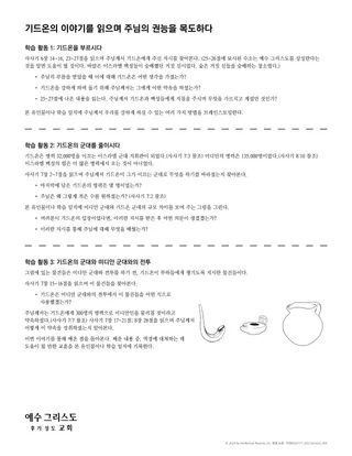 학생들이 유인물을 완료하면, 기드온의 이야기에서 배운 내용을 요약해서 말해 달라고 한다.
