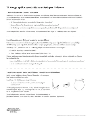 Lai palīdzētu audzēkņiem saskatīt, kā Tas Kungs svētīja Gideonu un viņa karapulku par paļaušanos uz Viņa spēku, jūs varētu izmantot izdales materiālu „Tā Kunga spēka saredzēšana stāstā par Gideonu”. Ļaujiet katram audzēknim iepazīties ar katras sadaļas saturu izdales materiālā. Viņi to var paveikt vairākos veidos.