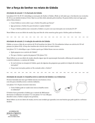 Para ajudar os alunos a ver como o Senhor abençoou Gideão e seu exército por confiarem Nele para sua força, você pode usar o material “Ver a força do Senhor no relato de Gideão”. Permita que cada aluno se familiarize com o conteúdo de cada seção do folheto. Há várias maneiras de fazer isso.