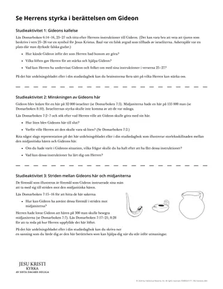 Efter att israeliterna hade bett om befrielse kallade Herren Gideon att befria dem från deras fiender. Herren visade sin styrka genom att hjälpa israeliterna besegra en här på mer än 135 000 soldater med endast 300 av Gideons män. Den här lektionen kan hjälpa eleverna att känna en större önskan att förlita sig på Jesus Kristus för att få styrka.