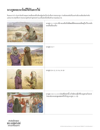 เพื่อดําเนินเรื่องราวของรูธต่อ ท่านอาจเชื้อเชิญให้นักเรียนทําเอกสารแจก “รูธและนาโอมีได้รับการไถ่” ให้ครบถ้วน นักเรียนอาจทํางานเป็นคู่เพื่อเขียนรายละเอียดที่สําคัญของเรื่องราว อีกทางเลือกหนึ่งคือแจกช่วงพระคัมภีร์ในเอกสารแจกให้นักเรียนและให้พวกเขาสรุปข้อเหล่านั้นด้วยคําพูดของตนเองกับคู่