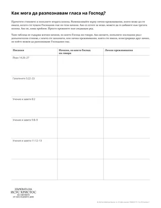 Дайте на учениците материала за раздаване „Как мога да разпознавам гласа на Господ?“. Бихте могли да направите първия ред от таблицата заедно, преди да ги поканите да довършат останалите редове. Може да е най-добре да им предложите да я попълнят сами, за да им дадете възможност за личен размисъл. Ако считате, че няма да имате достатъчно време за тази дейност, бихте могли да поканите учениците да направят само няколко реда или да продължите урока в друг ден.
