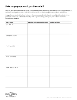 Dajte polaznicima uručak »Kako mogu prepoznati Gospodinov glas?« Razmotrite to da prvi redak tablice napravite kao razred prije nego što pozovete polaznike da dovrše preostale retke. Možda bi bilo najbolje pozvati polaznike da to sami dovrše kako bi omogućili osobno promišljanje. Ako smatrate da možda nemate dovoljno vremena za ovu aktivnost, razmislite o tome da pozovete polaznike da naprave samo nekoliko redaka ili razmislite o nastavku lekcije neki drugi dan.