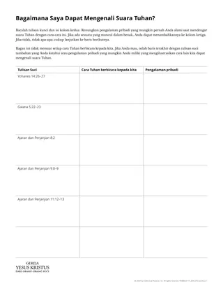 Berikan selebaran kepada siswa “Bagaimana Saya Dapat Mengenali Suara Tuhan?” Pertimbangkan untuk mengerjakan baris pertama bagan bersama kelas sebelum mengajak siswa menyelesaikan baris-baris yang tersisa. Mungkin yang terbaik adalah mengajak siswa untuk menyelesaikan ini sendiri untuk memperkenankan perenungan pribadi. Jika Anda merasa Anda mungkin tidak memiliki cukup waktu untuk kegiatan ini, pertimbangkan untuk mengajak siswa mengerjakan beberapa baris saja, atau pertimbangkan untuk melanjutkan pelajaran pada hari lain.