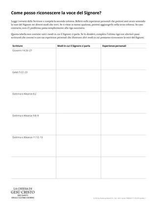 Distribuisci agli studenti la scheda “Come posso riconoscere la voce del Signore?”. Potete completare la prima riga della tabella come classe, poi invita gli studenti a riempire le righe rimanenti. Sarebbe meglio invitare gli studenti a riempirle da soli per permettere una riflessione personale. Se ritieni di non avere abbastanza tempo per questa attività, invita gli studenti a completare solo poche righe, oppure valuta se continuare la lezione un altro giorno.