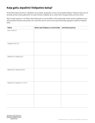 Išdalykite mokiniams dalijamąją medžiagą „Kaip atpažinti Viešpaties balsą?“ Galite kartu su visa klase užpildyti pirmąją lentelės eilutę, prieš paprašydami mokinių užpildyti likusias eilutes. Geriausia paprašyti mokinių atlikti šią užduotį savarankiškai, kad jie galėtų apmąstyti asmeniškai. Jei manote, kad šiai užduočiai atlikti neužteks laiko, galite paprašyti mokinių užpildyti tik kelias eilutes arba šią pamoką pratęsti kitą dieną.