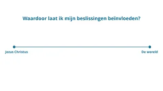 Net als veel mensen nu, worstelden de Israëlieten vanouds met de verleiding om erbij te willen horen in plaats van de Heer te gehoorzamen. De Heer leidde Israël jarenlang in het beloofde land door rechters zoals Samuel. Toen Samuel ouder werd, wilden de Israëlieten een koning ‘zoals alle volken’ hebben (1 Samuel 8:5) en wilden ze niet dat de Heer over hen regeerde. In deze les leren de cursisten hoe belangrijk het is om Jezus Christus te volgen in plaats van wereldse invloeden.