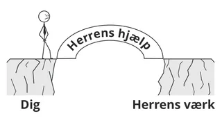 Du kan tegne en bro mellem hver side af billedet på tavlen og kalde den Herrens hjælp. Bed eleverne om at tegne noget tilsvarende i deres studiebog.