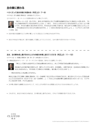 生徒がこの真理の理解を深めるのを助けるとよいでしょう。これを行う一つの方法として,配付資料「主の業に参加する」を使用してもよいでしょう。配付資料を半分に切り,もっと学びたい真理に焦点を当てている部分を生徒に選んでもらうとよいでしょう。この活動は,生徒各自でも,同じセクションを選択した2,3人のグループで行ってもらってもかまいません。
