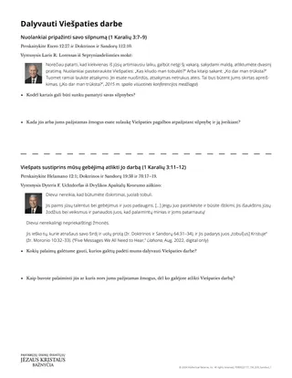 Galite padėti mokiniams geriau suprasti šią tiesą. Vienas iš būdų tai padaryti – naudojant dalijamąją medžiagą „Dalyvauti Viešpaties darbe“. Galite perkirpti dalijamąją medžiagą per pusę ir paprašyti mokinių pasirinkti skyrių, kuriame susitelkiama į tą tiesos dalį, apie kurią jie norėtų sužinoti daugiau. Mokiniai gali dirbti pavieniui arba su dviem ar trimis kitais mokiniais, pasirinkusiais tą patį skyrių.