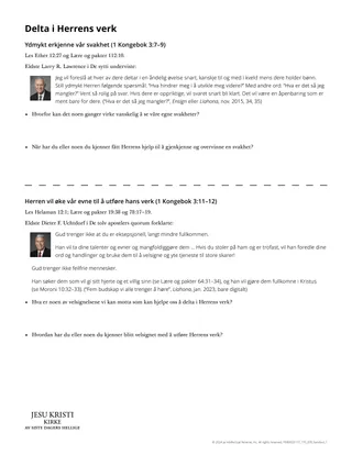 Du kan hjelpe elevene å utdype sin forståelse av denne sannheten. Én måte å gjøre dette på, er å bruke utdelingsarket “Delta i Herrens verk”. Du kan klippe utdelingsarket i to, og be elevene velge den delen som fokuserer på den delen av sannheten de ønsker å lære mer om. Elevene kan jobbe hver for seg eller sammen med to eller tre andre som valgte samme del.