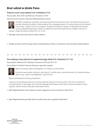 Możesz sprawić, że uczniowie pogłębią zrozumienie tej prawdy. Jednym ze sposobów, aby to zrobić, jest skorzystanie z ulotki pt. „Brać udział w dziele Pana”. Możesz przeciąć ulotkę na pół i poprosić uczniów, aby wybrali tę część prawdy, o której chcieliby dowiedzieć się więcej. Uczniowie mogą pracować indywidualnie lub z dwoma lub trzema innymi osobami, które wybrały tę samą część.