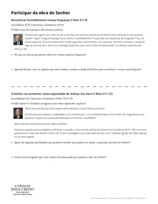 Peça a alguns voluntários que respondam para a classe. Incentive os alunos a levar o material para casa e a mostrar o que aprenderam para um membro da família ou amigo. Testifique do poder e da disposição do Senhor de nos abençoar com o que precisamos para trabalhar fielmente com Ele nesta grande obra.