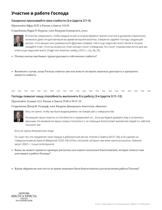 Возможно, вы захотите помочь студентам углубить их понимание этой истины. Вы можете, к примеру, использовать раздаточный материал «Участвуйте в работе Господа». Вы можете разрезать раздаточный материал пополам и предложить студентам выбрать раздел, посвященный части истины, о которой они хотели бы узнать больше. Студенты могут работать самостоятельно или в группах из 3–4 человек, выбравших один раздел.